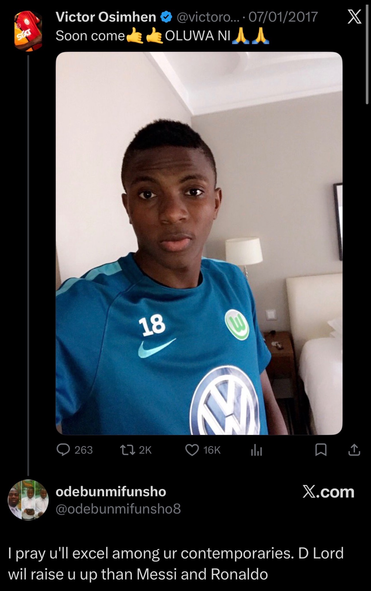The now-viral Twitter (X) post from 2017, when Osimhen was still a struggling child at Wolfsburg, is what led to the reunion. The man had made the prediction under one of his tweets from that year, saying that Osimhen would overcome his present hardships to become a “big footballer” and a global celebrity.