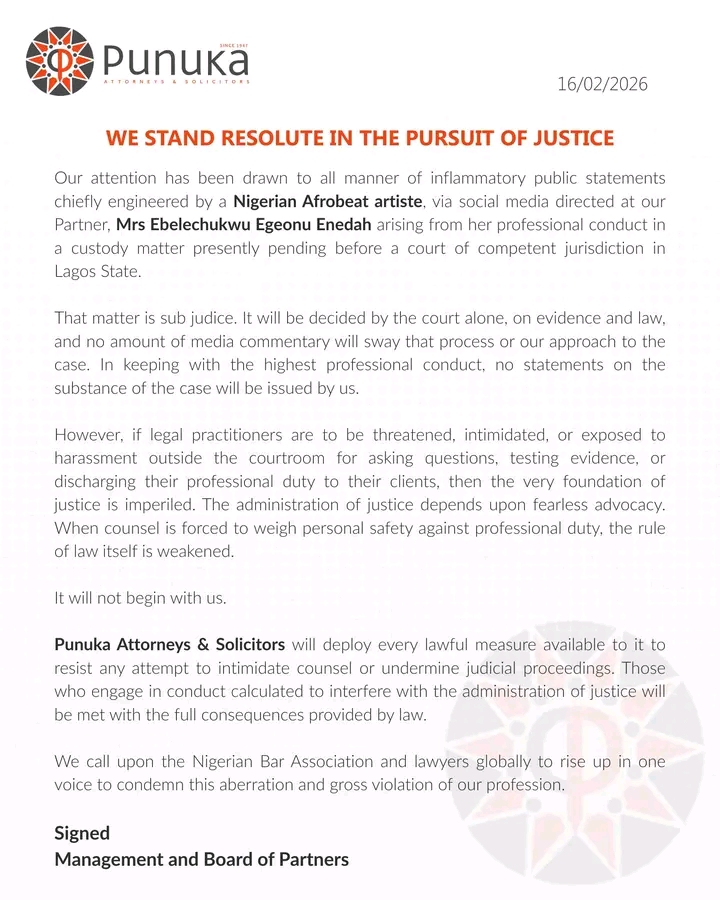 In a strong statement released on Monday, February 16, 2026, the firm defended its partner, Mrs. Ebelechukwu Egeonu Enedah, against what it described as “inflammatory public statements” and harassment orchestrated by the singer on social media.